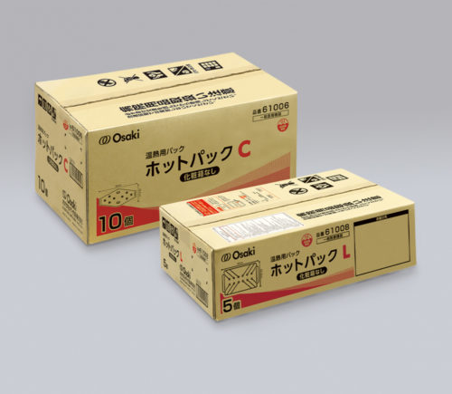 オオサキ ホットパック ●患部にしっかりフィットする、保温性に優れた温熱用パックです。 ●保温性に優れたゲルを使用しており、温熱効果による治療に適しています。 ●適用部位全体を温めることができるよう、ゲルが均一になる形状です。 ●加温槽を使用することで、70〜80℃を保持し、適温で使用できます。 ●全身に使用できますが、Cタイプは、頸部、肘、膝などの部位、Lタイプは、背中、腰などの部位に適しています。 オオサキ ホットパック [温熱用パック 37240010] 品 番種 類規 格ケース入数 61005オオサキ ホットパック C幅18.5cm × 長さ43cm 1個入10箱61006オオサキ ホットパック C 化粧箱なし幅18.5cm × 長さ43cm 10個入-61007オオサキ ホットパック L幅26.5cm × 長さ43cm 1個入5箱61008オオサキ ホットパック L 化粧箱なし幅26.5cm × 長さ43cm 5個入- ■販売名:オオサキホットパック ■届出番号:23B2X10001000094 ■素材:[本体]ポリ塩化ビニル [内容物]保温ゲル(水、水溶性ポリマー、防腐剤) ■製造国:日本 製品案内 医療関係者向け製品一覧 一般のお客様向け製品一覧 製品カタログ 添付文書一覧